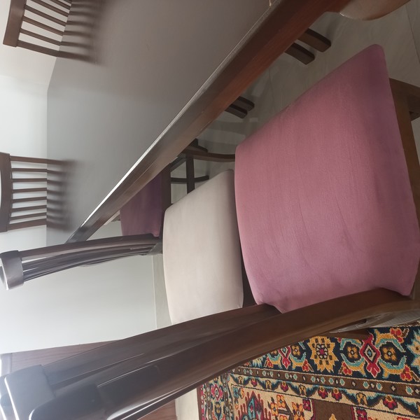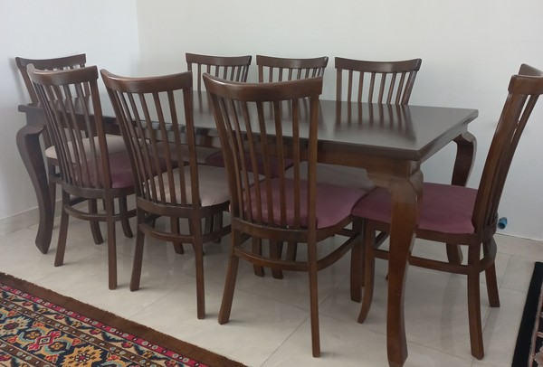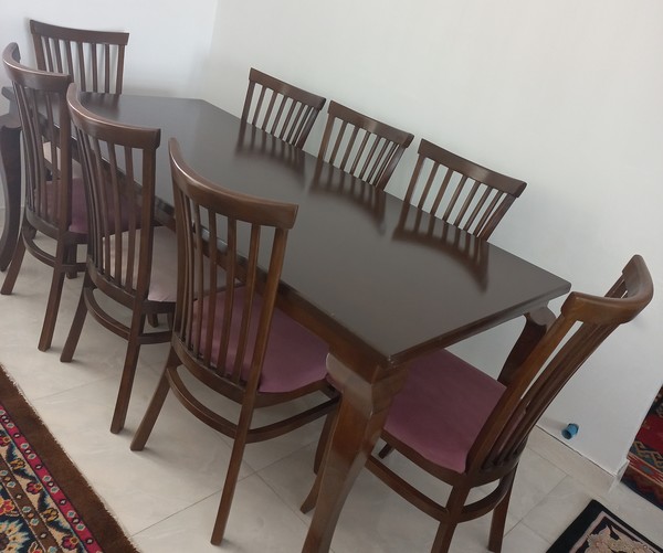میز غذا خوری هشت نفره کاملا سالم و تمیز، فقط یه جاهایی از میز تو اثاث کشی سائیدگی کوچیک داره